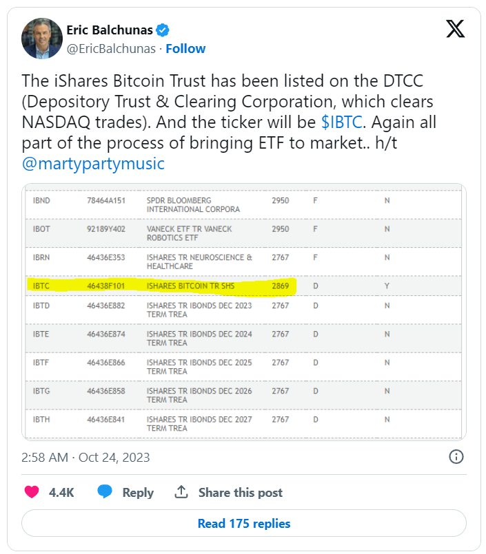 Emergence of a Unique ID on DTCC. Again, another pump was seen yesterday when the iShares Bitcoin Trust was listed on the Depository Trust & Clearing Corporation (DTCC, which clears Nasdaq Trades). While it's not a guarantee of ETF approval, the fact that BlackRock is expressing confidence is certainly a positive indicator.